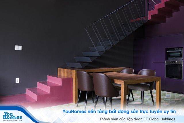Hầu hết các nội thất bên trong căn phòng và màu sơn tường đều mang gam màu tối. Sàn nhà sử dụng họa tiết hình lục giác nhiều màu để trang trí làm nổi bật các nội thất màu tối. Bậc cầu thang màu hồng tạo điểm khác biệt cho căn phòng.