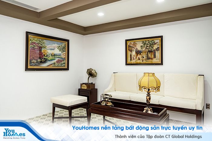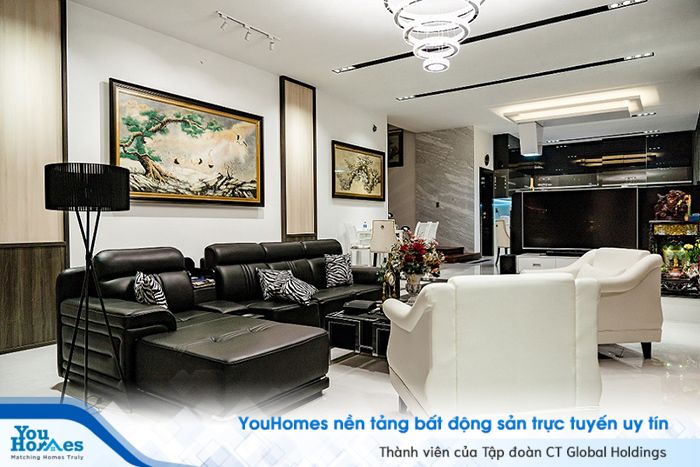 Mỗi gian phòng hay không gian trong căn hộ lại có một phong cách thiết kế khác nhau để không gây nhàm chán của người sử dụng. Phòng khách của căn biệt thự có diện tích khá rộng với phong cách hiện đại chủ đạo, điểm nhấn đáng chú ý nhất là bộ sofa đen trắng cùng nhiều bức tranh trang trí đẹp mắt.