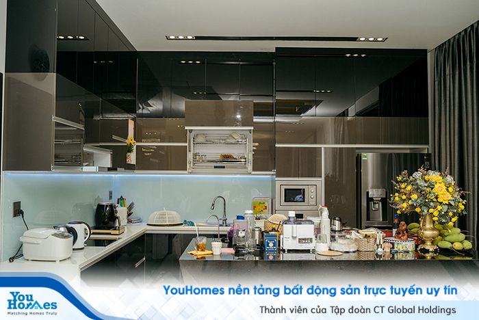 Khu vực nhà bếp cũng cực kỳ rộng rãi với đầy đủ tiện nghi. Tủ bếp sử dung màu ghi, xám thời thượng và sang trọng.