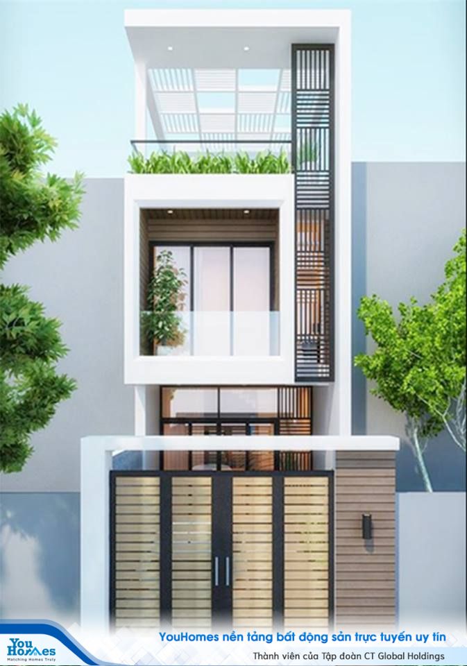 Mái bằng được sử dụng trong mẫu thiết kế này. Hệ thống cửa kép được sử dụng tiện lợi, cửa chính dành cho xe ô tô, còn việc đi lại bình thường sẽ sử dụng cửa phụ tiện lợi. Cây xanh và được bố trí ở các tầng. Đặc biệt những chậu hoa nhỏ nhắn được chủ nhà trồng trên mái đem lại sự khác biệt cho căn nhà.