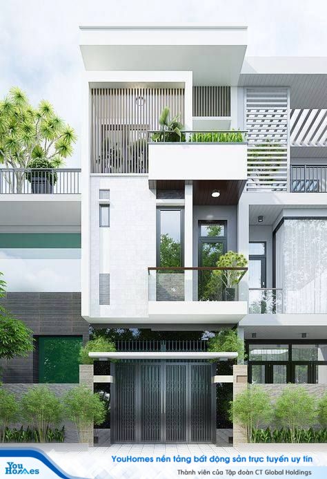 Ngôi nhà này được thiết kế theo lối kiến trúc hiện đại. Kết hợp mái thái đi cùng tông màu trắng chủ đạo giúp tôn lên nét đẹp uy nghi và sang trọng. Cửa kính kết hợp với rèm được sử dụng giúp căn hộ đón ánh sáng tự nhiên đồng thời cũng đem lại sựu riêng tư khi cần thiết. Những chậu cây xanh nhỏ được bố trí điểm xuyết sắc xanh cho căn nhà.