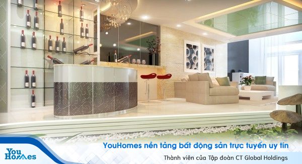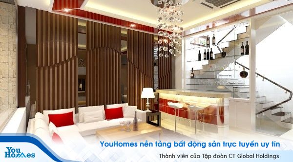 Mẫu phòng khách với cách bố trí những lam gỗ đặc xen kẽ các mảng kính mang đến vẻ thoáng đãng, hài hòa. Một số chi tiết nội thất với tông màu trắng - đỏ đan xen giúp quân bình âm - dương. Ngoài ra gam màu đỏ cũng rất phù hợp với những người mệnh Hỏa. Mẫu phòng khách ấm cúng và cũng không kém phần sang trọng với quầy bar nhỏ nhắn thời thượng.