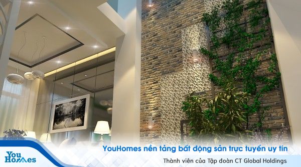 Cây xanh và tường đá với đèn màu vàng ấm tạo thế cương - nhu hòa hợp cho khu vực thông tầng. Ngoài ra phần tường đá còn là một điểm nhấn trang trí đặc biệt của ngôi nhà, làm cho ngôi nhà trở nên nhiều màu sắc và hòa hợp hơn với thiên nhiên.