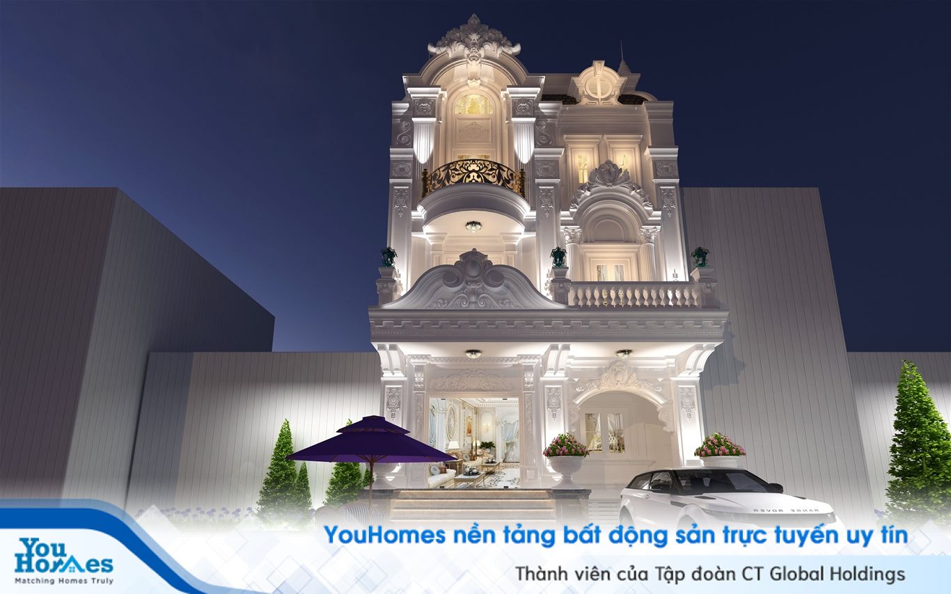 Biệt thự Pháp với tông màu trắng chủ đạo được thiết kế đèn chiếu màu hồng giúp không gian trở nên huyền ảo. Phần gara ô tô được thiết kế bên ngoài rất tiện lợi cho việc sinh hoạt. Các chi tiết thiết kế đều được thi công một cách tỉ mỉ càng làm cho căn biệt thự trở nên tinh tế.
