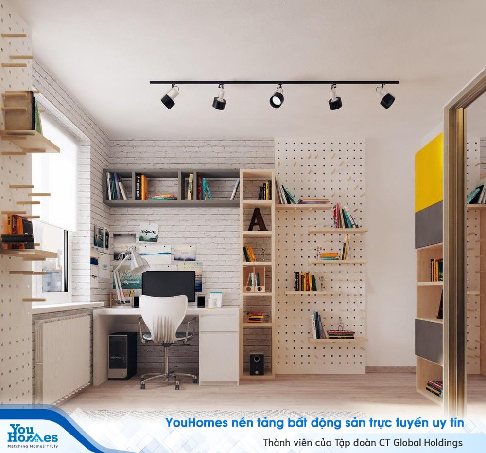 Chiếc bàn học tưởng chừng đơn giản nhưng khi kế hợp với tủ sách và bức tường độc đáo, không gian học tập đầy sáng tạo này sẽ tạo sự thích thú cho trẻ. Tủ sách gắn liền vào tường với thiết kế bắt mắt với các ngăn lớn nhỏ khác nhau. Các bé có thể treo những bức tranh, khung hình yêu thích ở khoảng tường ngay trên phía bàn học. Bức tường có nhiều lỗ tròn có thể tùy chỉnh để treo các móc treo bên trên. Bé yêu sẽ thỏa sức sáng tạo trong không gian tuyệt vời này!