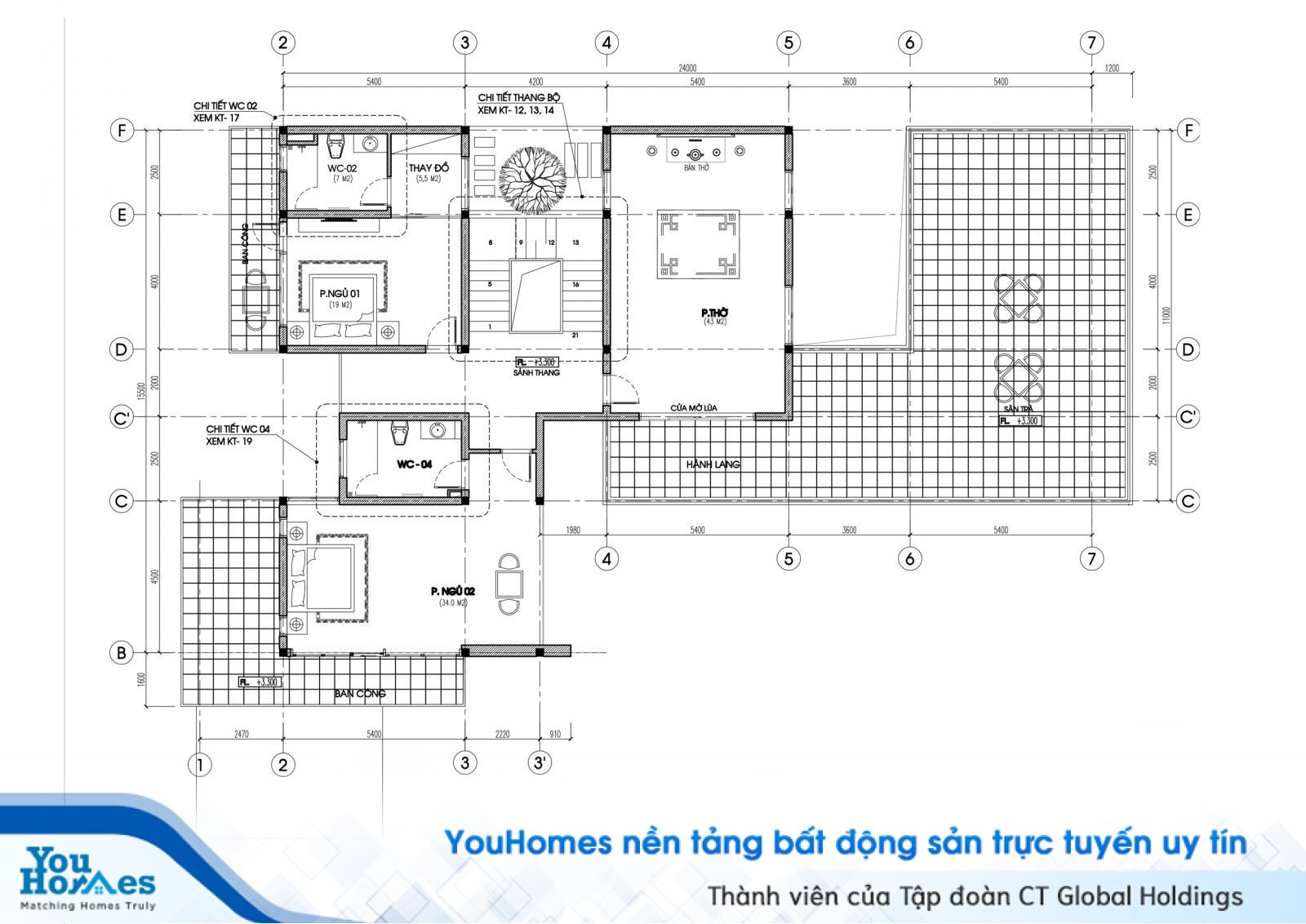 Tầng 2 được thiết kế 2 phòng ngủ rộng 16m, cả 2 phòng đều có nhà vệ sinh khép kín, có một phòng thiết kế phòng thay đồ. Đối diện phòng ngủ là phòng thờ được thiết kế về phái hàng lang sân trước khá rộng và thoáng mát, giúp gia chủ chuẩn bị tốt nhất cho không gian linh thiêng.