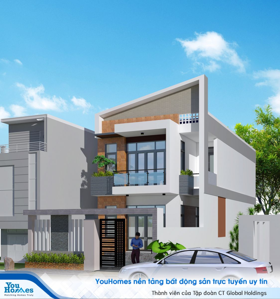 Thiết kế khá tinh tế và hiện đại khoa học, kiến trúc sư đã khéo léo kết hợp kiểu mái lệc với khối chéo kết hợp cùng những khối trụ bê tông vuông vức ở mặt tiền tầng 2, được ốp gạch nghệ thuật màu vàng để cân đối hình khối cũng như là màu sắc cho ngôi nhà. Nhìn từ xa, chúng ta ấn tượng với mẫu thiết kế nhà khỏe khoắn, vững chãi, bề thế và cân đối. Gia chủ đã khá hài lòng với mẫu nhà hiện đại có kinh phí đầu tư chưa đến 1 tỷ.
