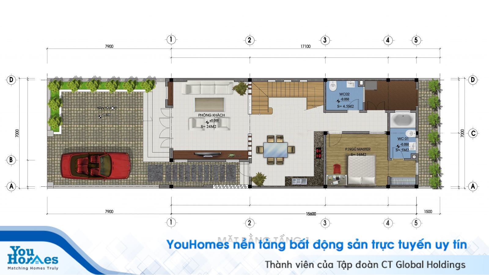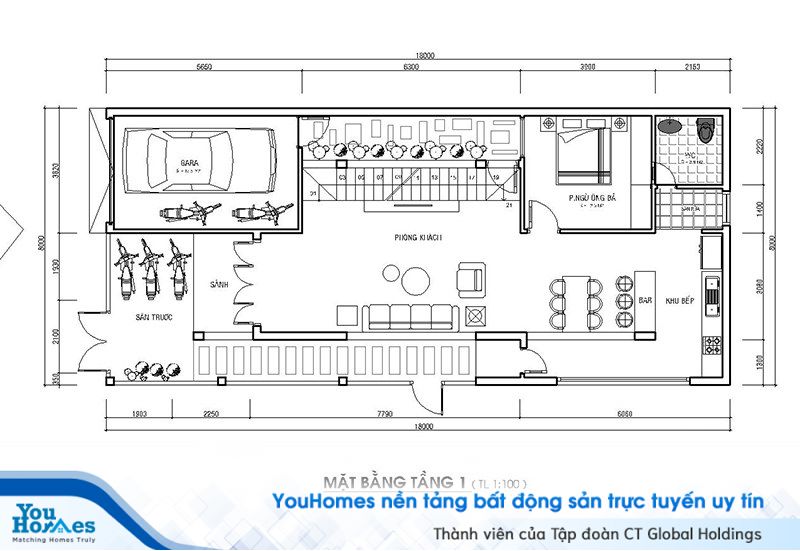 Tầng 1 mặt tiền 5m được thiết kế ga ra để xe ô tô và xe máy, đi vào trong là không gian phòng khách và bếp nấu. Tại phòng khách phía tay trái có thiết kế đáy giếng trời hình chữ nhật trồng tiểu cảnh đẹp mắt, với không gian xanh mướt và vô cùng ấn tượng. Phía trong là phòng bếp với thiết kế hiện đại, kết hợp với Bar để phục vụ những bữa tiệc nhỏ của gia đình.