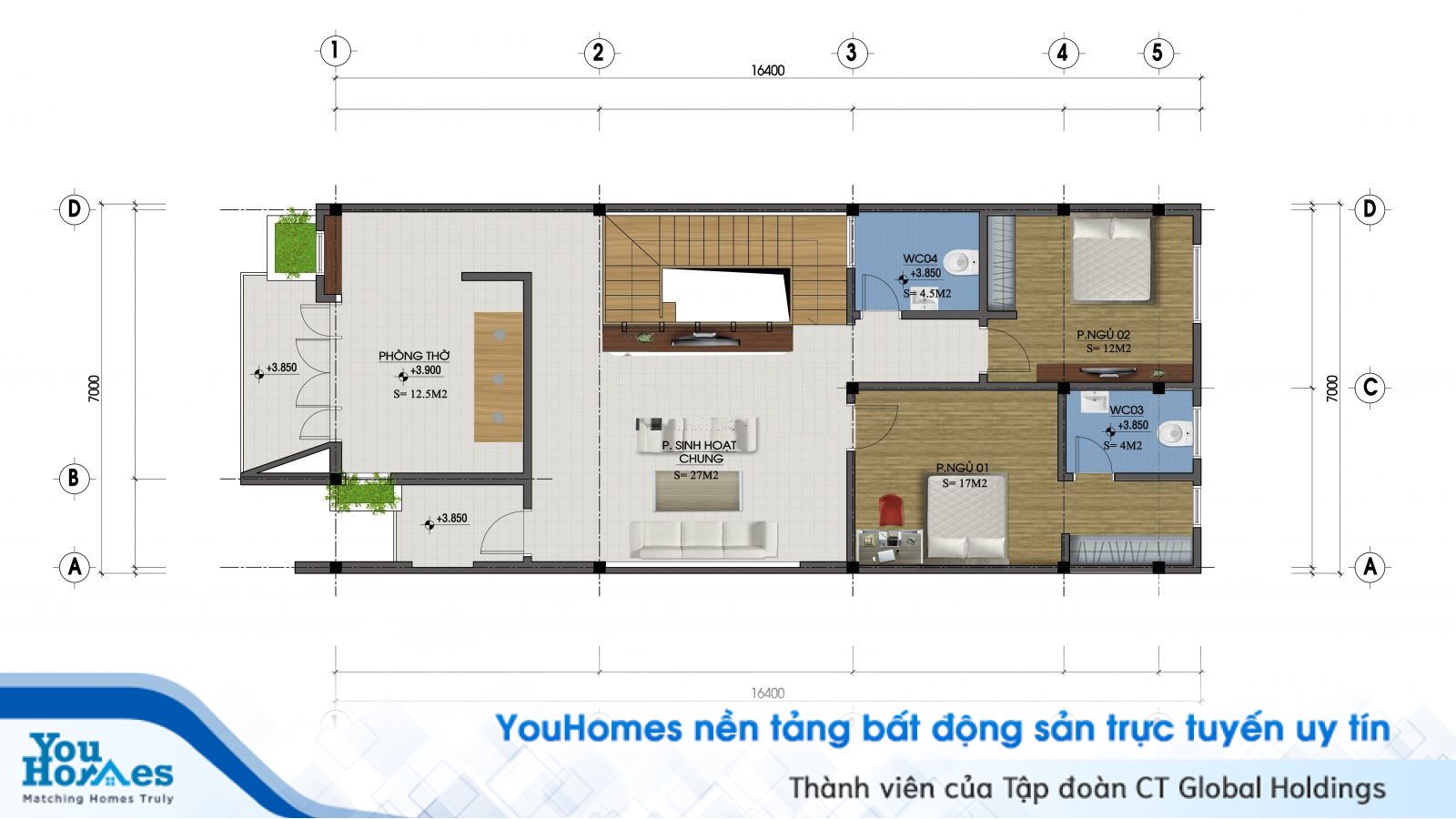 Tầng 2 được bố trí 1 phòng ngủ 17m có nhà vệ sinh khép kín, một phòng ngủ 12m sử dụng nhà vệ sinh chung của cả tầng 2. Phòng sinh hoạt chung được thiết kế gần không gian đệm của cầu thang, phòng thờ được thiết kế hướng ra ban công trước.