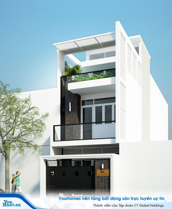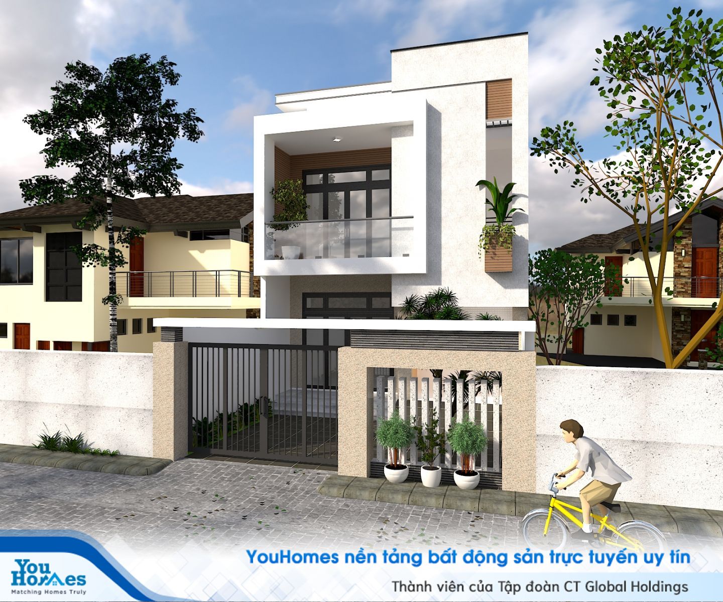 Mẫu thiết kế này có hình khối đơn giản với gam màu trắng sáng tinh khiết, nhẹ nhàng. Khối cổng đổ bê tông và khối đua trên tầng 2 giúp cho mẫu nhà thêm cân đối và khỏe khoắn. Trong tổng thể màu trắng ấy, là những chậu cây xanh điểm xuyết, tạo nên không gian tràn đầy sức sống, gần gũi với thiên nhiên hơn.