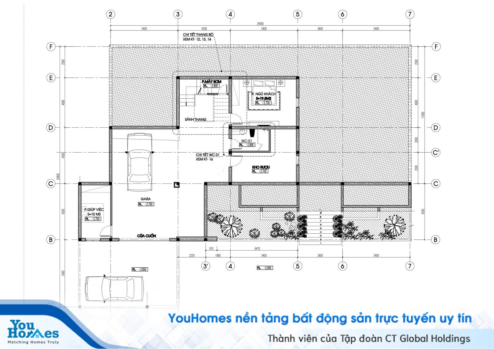 Tầng hầm được thiết kế những không gian tách biệt hoàn toàn với gia chủ, thiết kế có ga ra ô tô, phòng ngủ người giúp việc, nhà vệ sinh chung, kho đựng đồ và phòng ngủ của khách đến chơi ở lại qua đêm.
