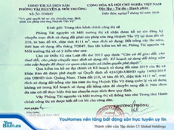 Ngày 7/01/2019, ông Huỳnh Tấn Vỹ có đơn xin phép chuyển mục đích sử dụng đất gửi UBND thị xã Điện Bàn về việc xin chuyển mục đích 4.111m2 đất trồng cây lâu năm nói trên để sang mục đích đất ở, thời hạn sử dụng lâu dài. Sau khi xem xét hồ sơ xin chuyển mục đích sử dụng đất của ông Vỹ, ngày 18/2/2019, Phòng TN&MT thị xã Điện Bàn có Công văn số 30/TNMT về việc giải quyết hồ sơ xin chuyển mục đích phải xin phép của ông Huỳnh Tấn Vỹ.