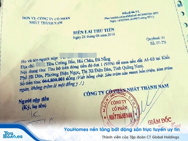 Biên lai thu tiền đặt cọc mua đất nền do ông Hoàng Văn Ngọc – Giám đốc Công ty CP Nhất Thành Nam ký.