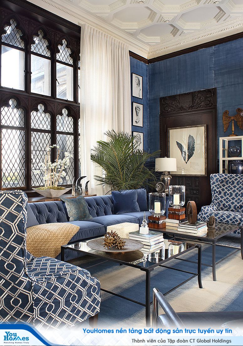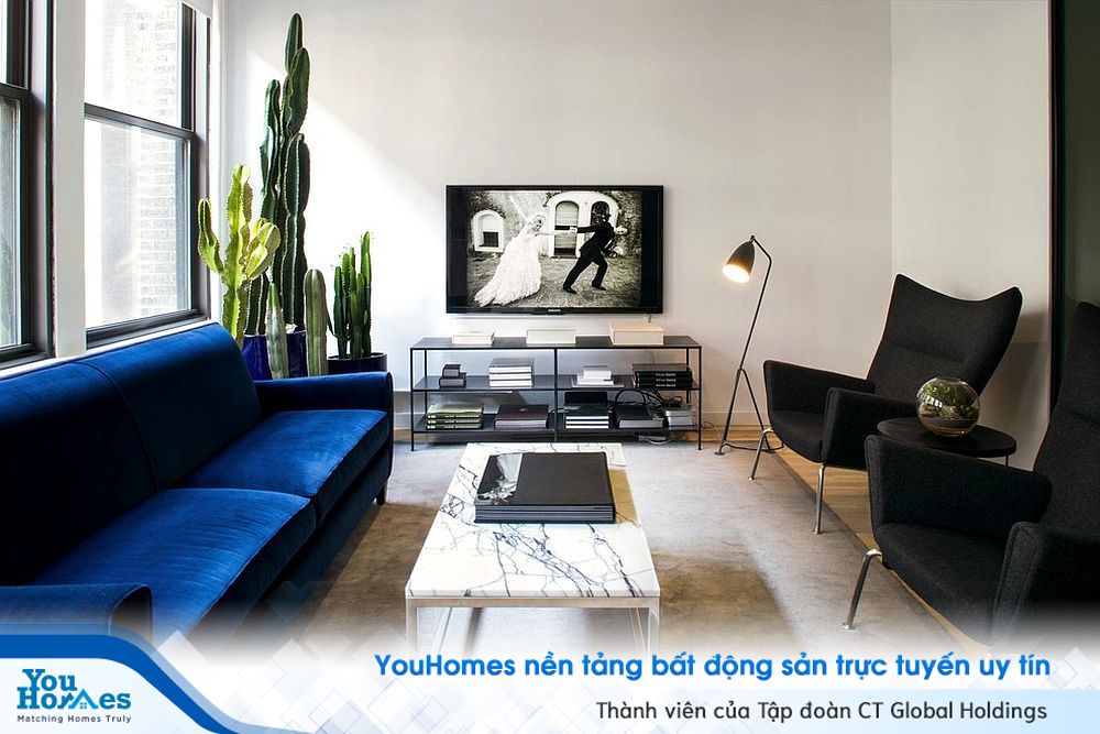 Không cần quá cầu kỳ, màu xanh và đen nổi bật trong căn phòng từ sự kết hợp giữa các nội thất trong sang trọng và hiện đại.