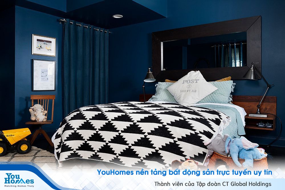 Cũng giống như màu trắng và màu xanh, thậm chí sự kết hợp của màu đen và màu xanh có thể được sử dụng trong các phòng có nhiều kiểu dáng. Khung viền giường màu đen, đồ vật trang trí và cùng các điểm nhấn thông minh trên tường xanh mát tạo được cá tính riêng của chủ nhân căn phòng.