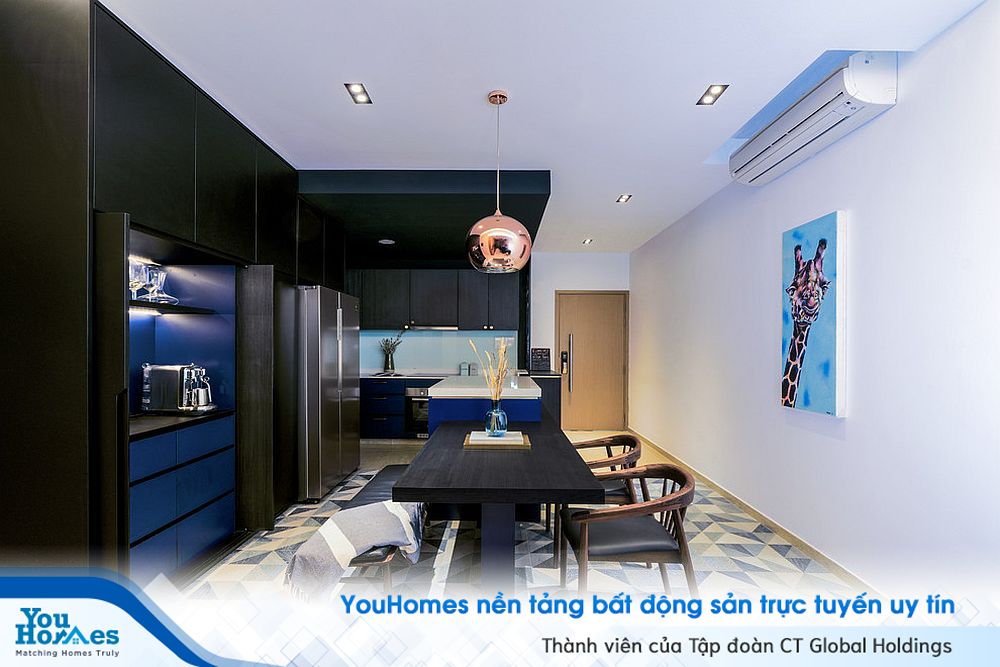 Nhà bếp và phòng ăn trông thật sang trọng và hiện đại với sự kết hợp của hai màu xanh và đen trong nền tường màu trắng. Ngoài ra, sàn nhà có sự kết hợp đặc biệt của bốn màu: xanh đen, xanh dương, màu ghi và màu trắng với họa tiết đơn giản trông rất bắt mắt.