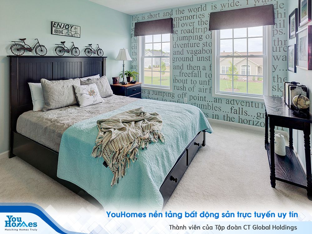 Trong khi màu xanh hải quân và màu đen là sự kết hợp màu sắc phổ biến, bạn có nhiều lựa chọn hơn bằng cách thay thế các màu xanh đậm hơn bằng màu sáng hơn. Màu xanh nhạt và màu đen có thể không cảm thấy quá đậm, nhưng nó vẫn có nhiều sức hấp dẫn trong không gian phong cách chiết trung, Địa Trung Hải và Scandinavi. Trang trí đơn giản, lạ mắt với những chiếc xe đạp nhỏ màu đen phía trên chiếc giường tạo cảm giác nhẹ nhàng, thư thái. Bức tường màu xanh nhạt trong căn phòng không trang trí quá cầu kỳ mà nó được trang trí đơn giản như một tờ tin tức rất độc đáo và cá tính.