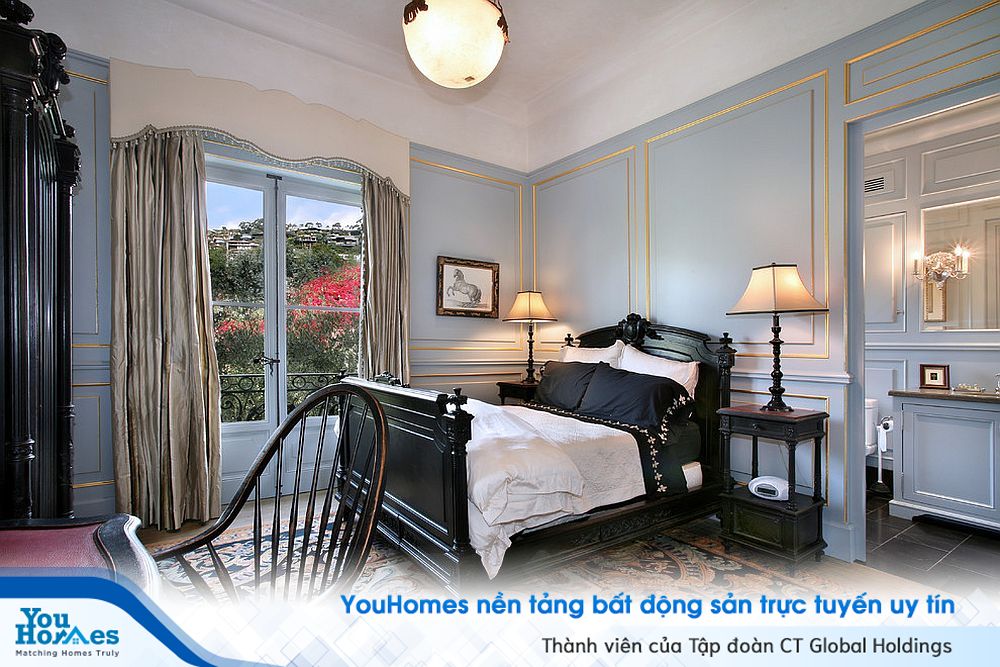 Hãy thử các sắc thái khác nhau của màu xanh trong phòng trước khi bạn quyết định sử dụng cho căn phòng yêu thích của mình. Phòng ngủ theo phong cách Địa Trung Hải hiện đại với màu xanh nhạt và đen thêm một chút sắc tím. Từng chi tiết trong căn phòng được thiết kế và bố trí rất hài hòa. Các góc cạnh và đường nét trên tường nhà có những đường kẻ màu vàng óng nổi bật. Tấm thảm trải trên sàn nhà có hoa văn đặc sắc góp phần làm căn phòng thêm bắt mắt hơn.