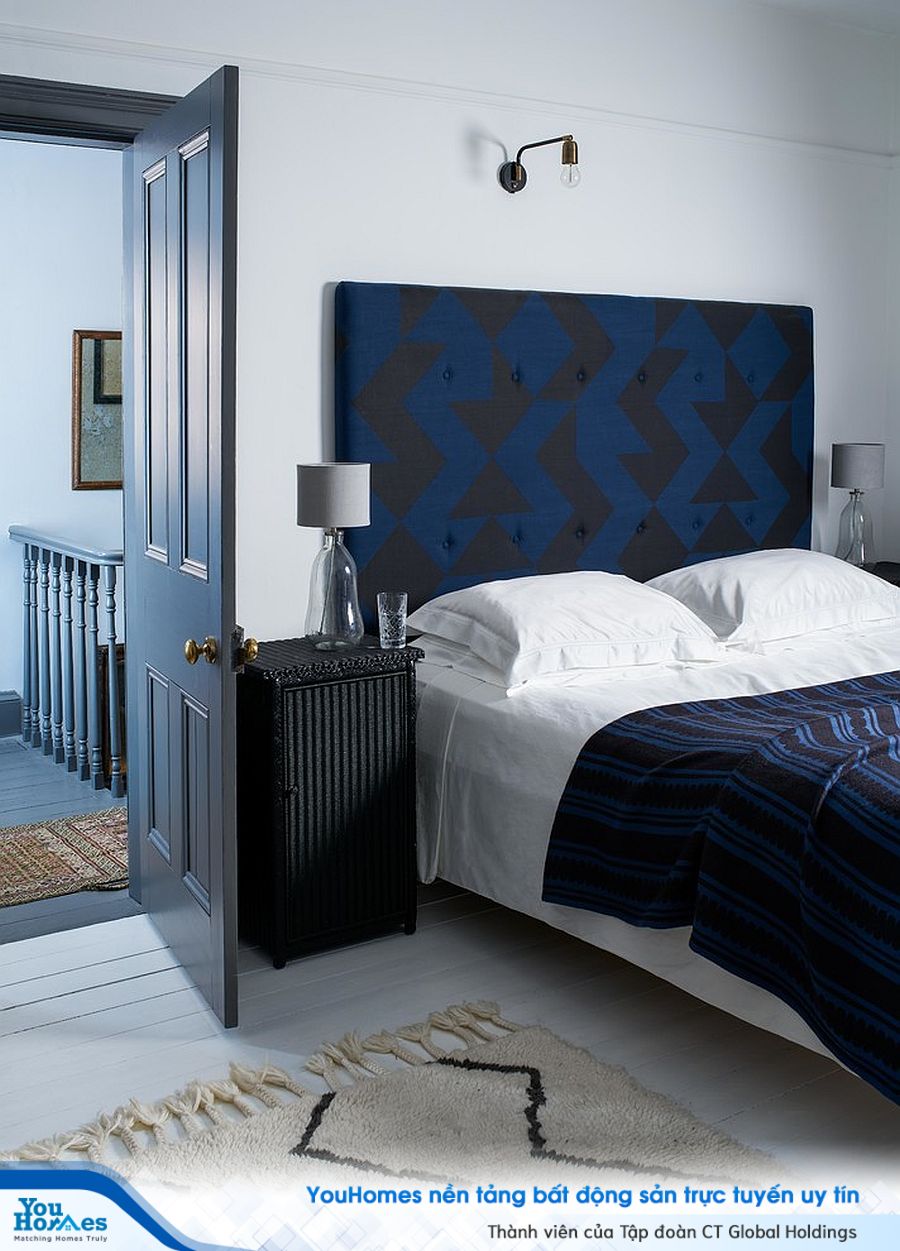 Sự pha trộn thông minh giữa màu xanh và màu đen trong phòng ngủ màu trắng đương đại.