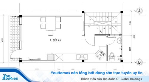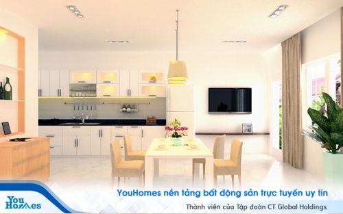 Mẫu thiết kế không gian chung cho ngôi nhà 4 tầng với phòng bếp, phòng khách và phòng ăn nằm cùng một không gian. Những gam màu được sử dụng đều là các tông màu nhẹ nhàng giúp cả căn nhà trở nên sáng sủa và gọn gàng với sự sắp đặt và bố trí khá hợp lý. Bàn ăn được bố trí giữa nhà với dãy đèn treo cực kỳ hợp lý giúp phân bổ đều ánh sáng.