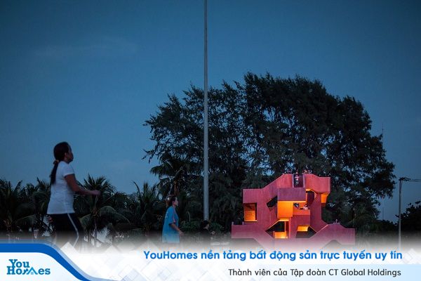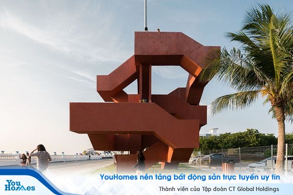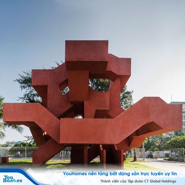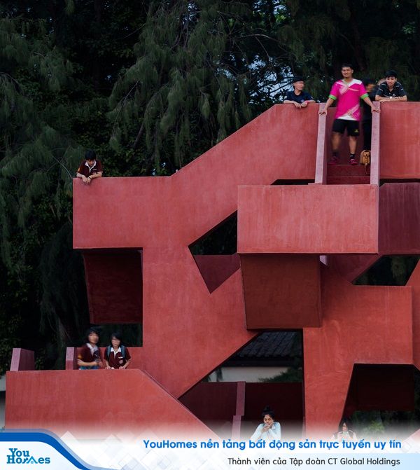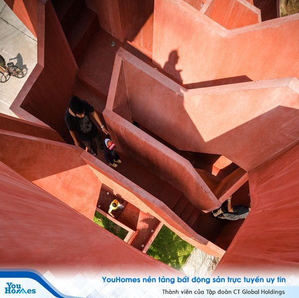 Được xem như một sân chơi cộng đồng, thực tế Tháp 10Cal là một mê cung bê tông xếp chồng, mang tông màu đỏ gạch, dành cho nhiều trẻ em và người lớn leo lên.