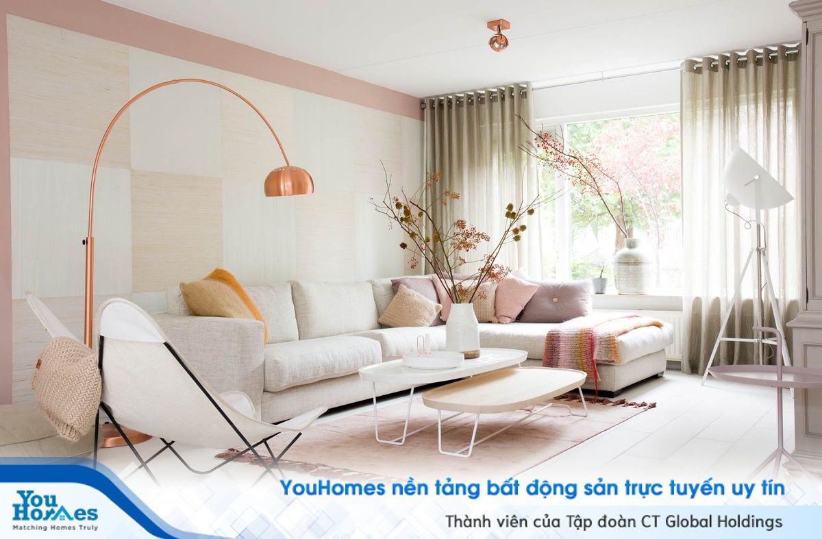 Gam màu hồng nhẹ nhàng nữ tính sẽ rất phù hợp cho các cô nàng mệnh Hỏa. Màu hồng tưởng chừng khá khó có thể kết hợp hay ứng dụng trong không gian phòng khách nhưng với sự lựa chọn tông màu phù hợp, điều này là hoàn toàn có thể. Những gam màu hồng phấn nhạt có thể dễ dàng kết hợp với những mày trắng, xám hay ghi sẽ đem lại hiểu quả thẩm mỹ tuyệt vời cho phòng khách.