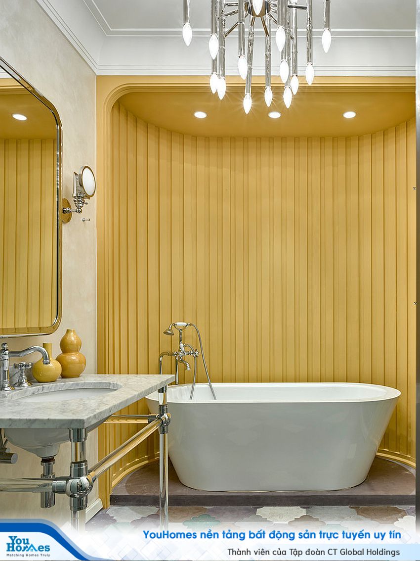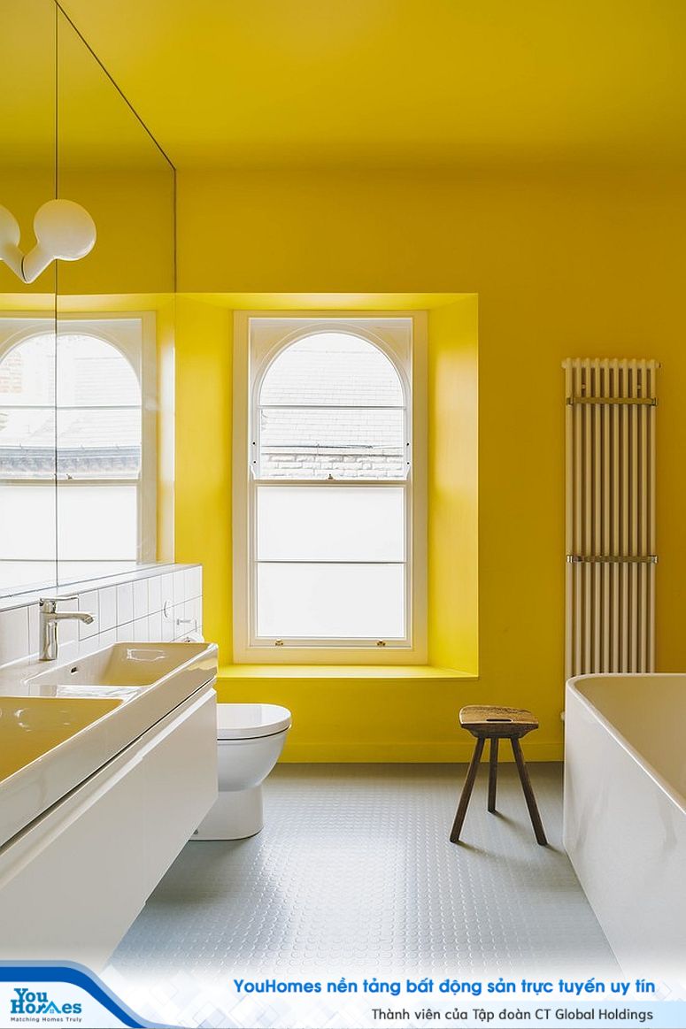 Sự hiện diện của khu vực tắm màu vàng mang lại độ sáng cho phòng tắm này.