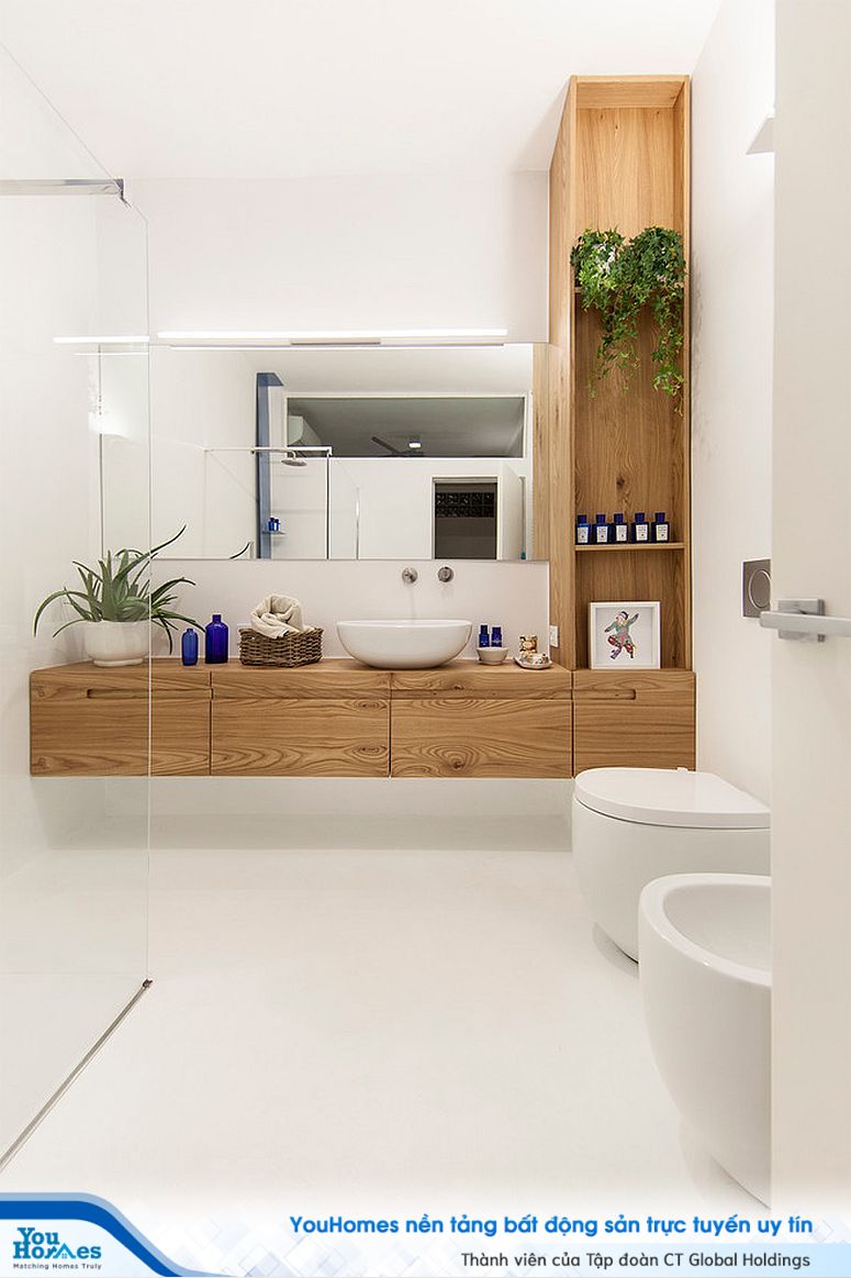 Sử dụng tinh tế màu vàng trong phòng tắm trắng hiện đại. Điểm nhấn trắng và màu gỗ ấn tượng
