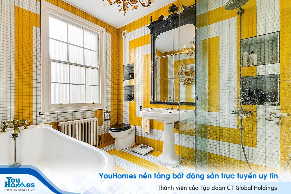 Sử dụng khéo léo màu trắng và màu vàng với gạch lát trong phòng tắm.