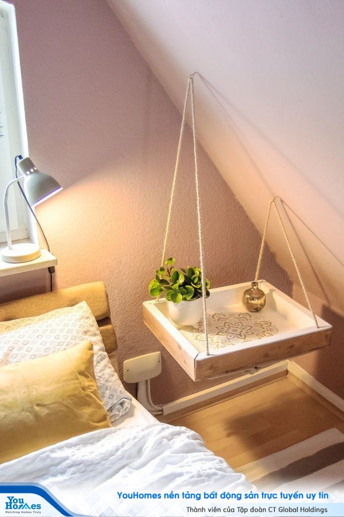 Tạo một đầu giường treo bằng cách cố định dây vào bốn góc của khay gỗ, mang cây xanh vào không gian phòng làm tăng không gian lưu trữ trong căn phòng và trang trí đẹp mắt.
