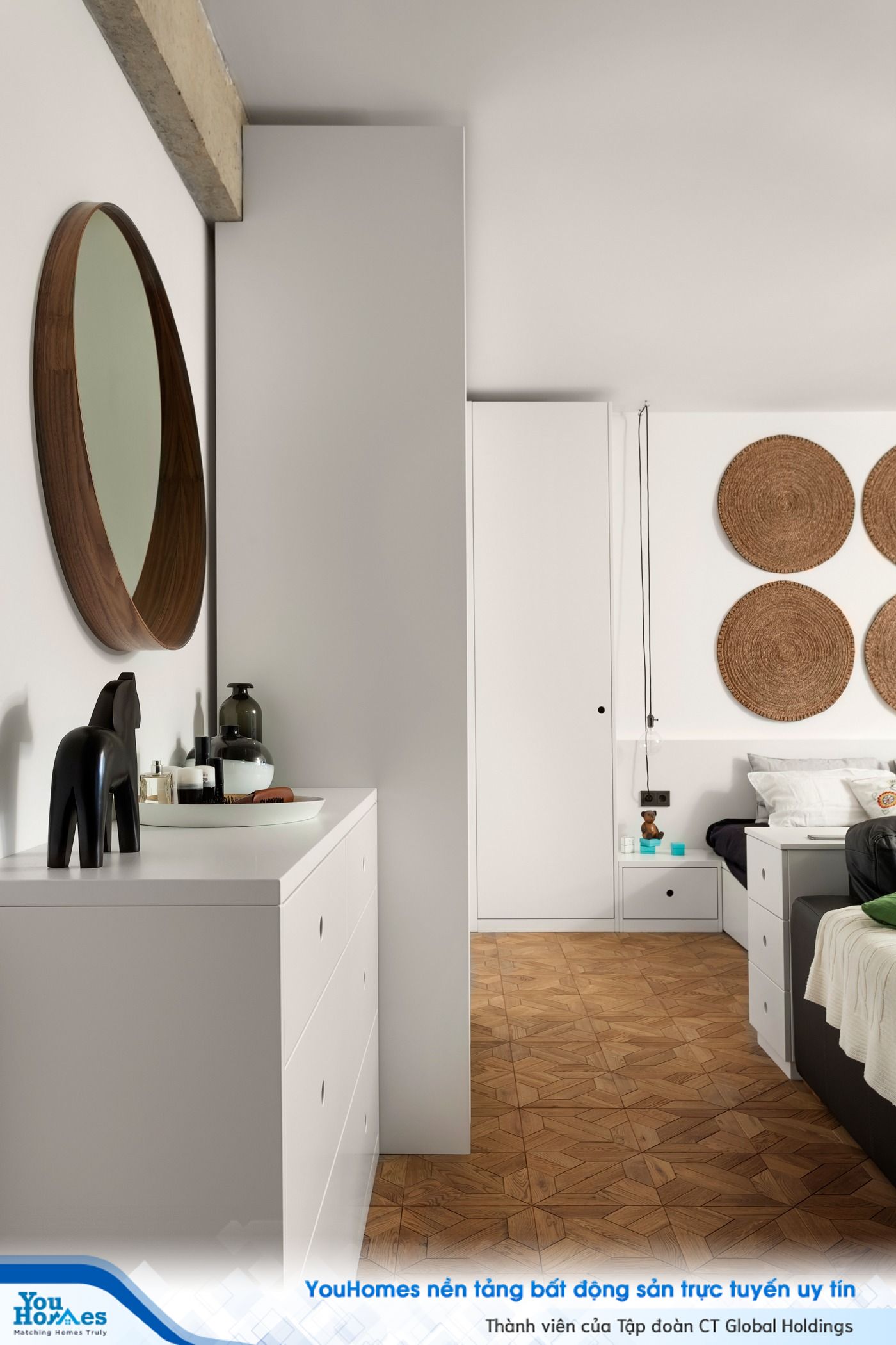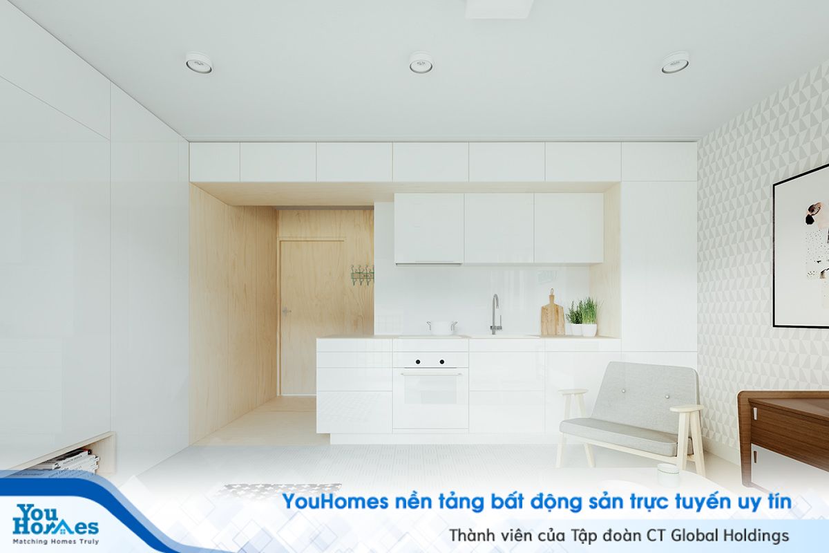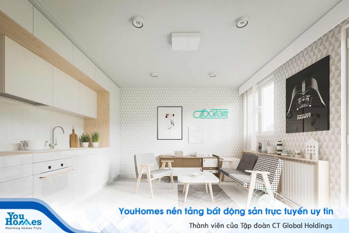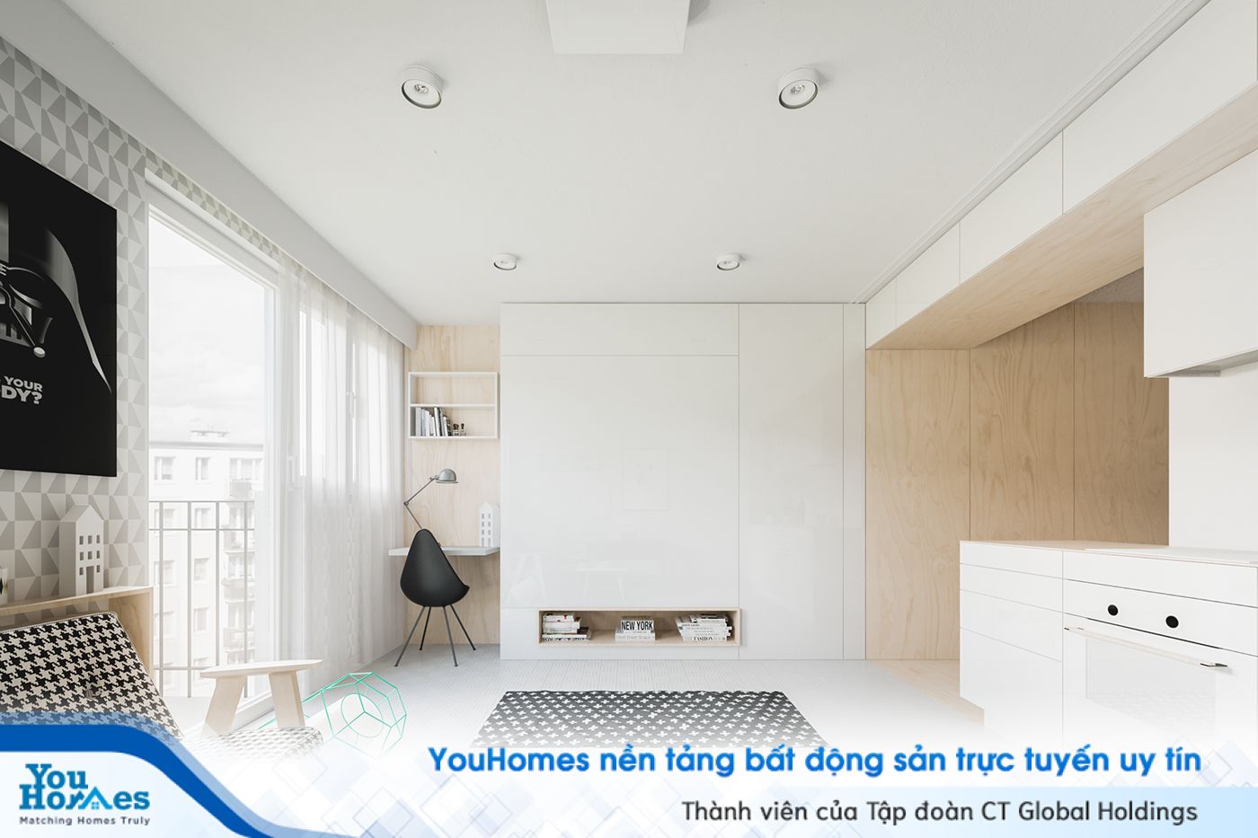 Còn đây là một căn hộ studio tinh xảo. Mỗi không gian đều khác biệt về mặt thẩm mỹ và chức năng, xen kẽ với các đặc điểm phối hợp thông minh để thống nhất không gian tổng thể.