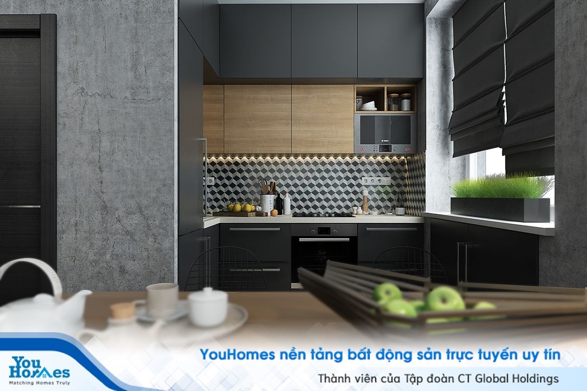 Khi khu vực sinh hoạt và ngủ có màu sắc tươi sáng hơn, phòng ăn và nhà bếp sẽ có một bảng màu tối hơn. Tủ gỗ bổ sung các vật liệu nội thất tự nhiên được sử dụng trong nhà.