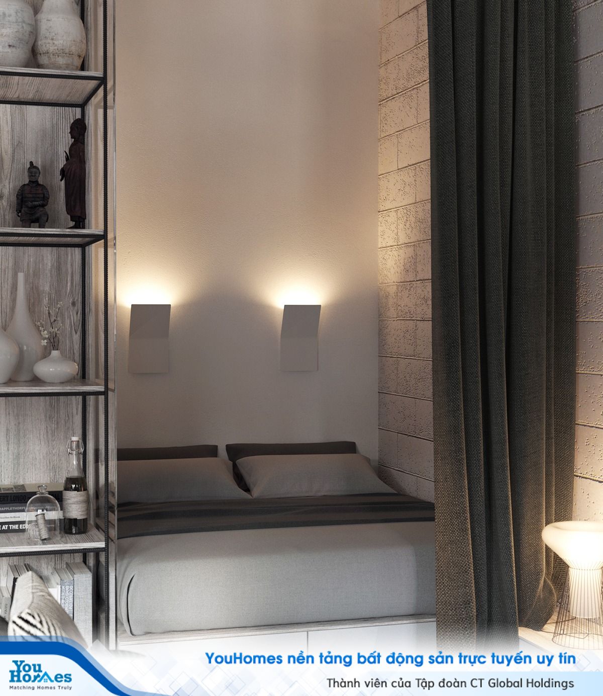 Khu vực ngủ này là căn phòng hoàn hảo trong một căn phòng. Rèm treo từ một hốc lõm cũng cung cấp một chút ánh sáng gián tiếp mềm mại để thư giãn vào buổi tối, sau những giờ làm việc căng thẳng.