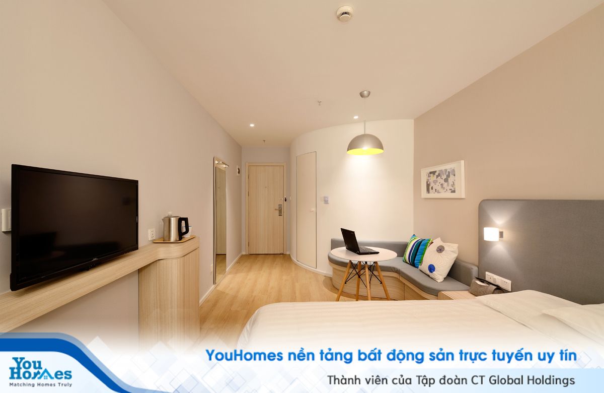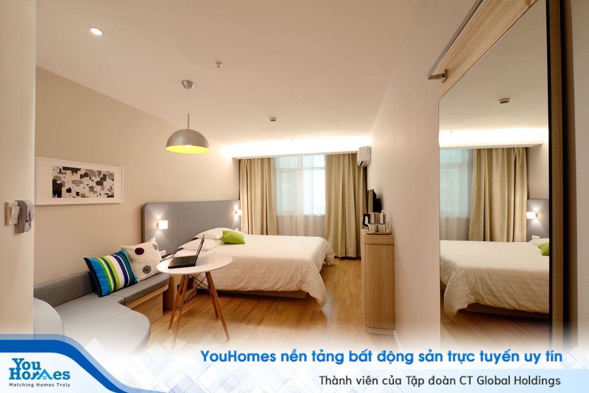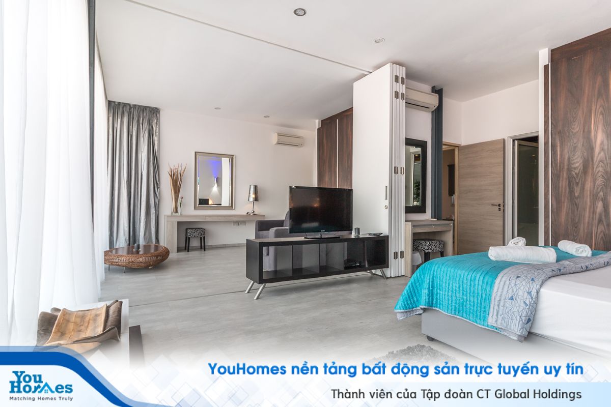 Tận dụng lợi thế về mặt diện tích, có thể tạo thêm không gian với phòng ngủ và phòng khách thông nhau, tạo ra không gian rộng rãi, khi cần riêng tư có thể ngăn lại bằng hệ thống vách ngăn di động.