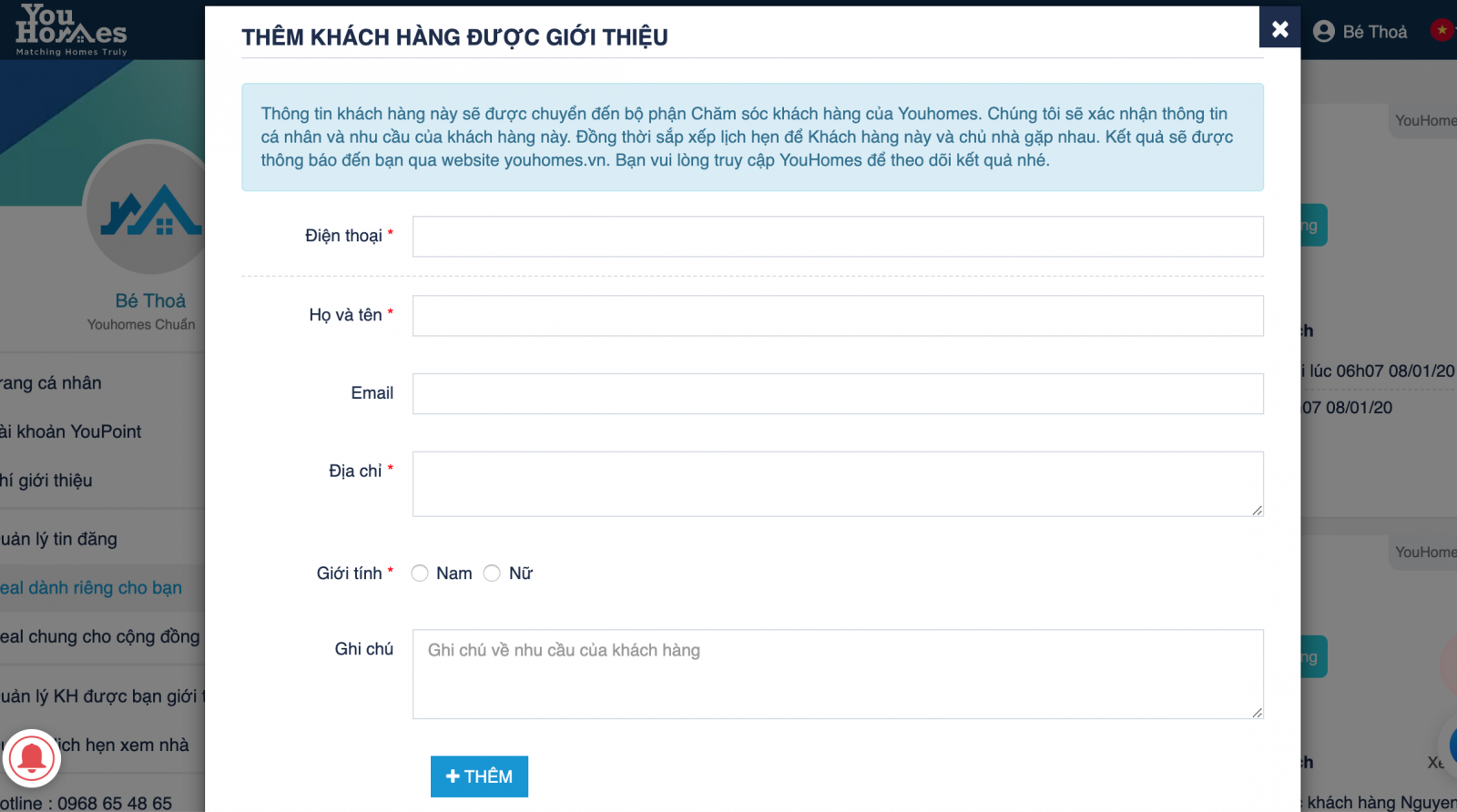 - Bạn điền đầy đủ thông tin khách hàng được giới thiệu vào form sau khi điền xong bấm nút "Thêm".