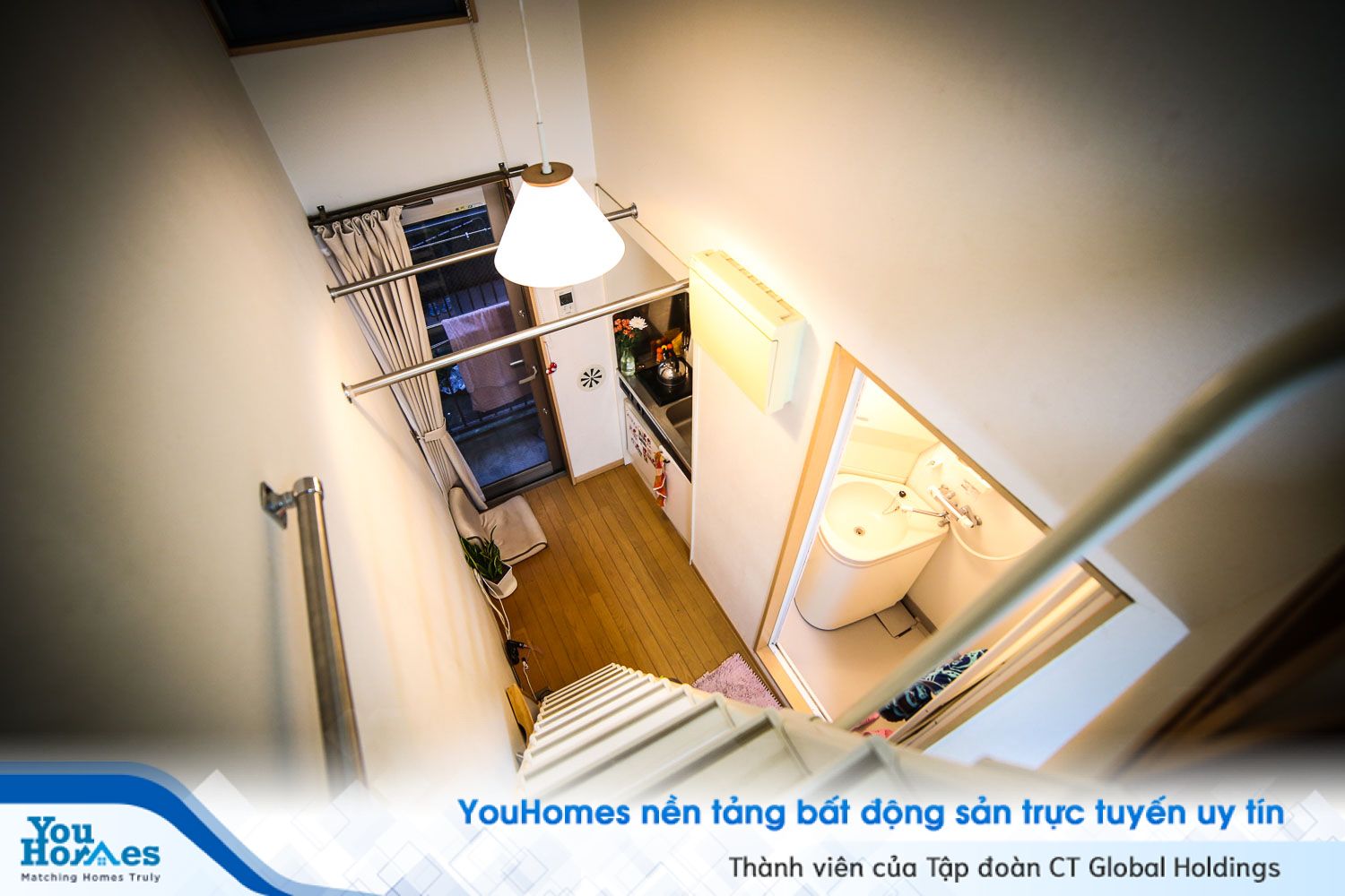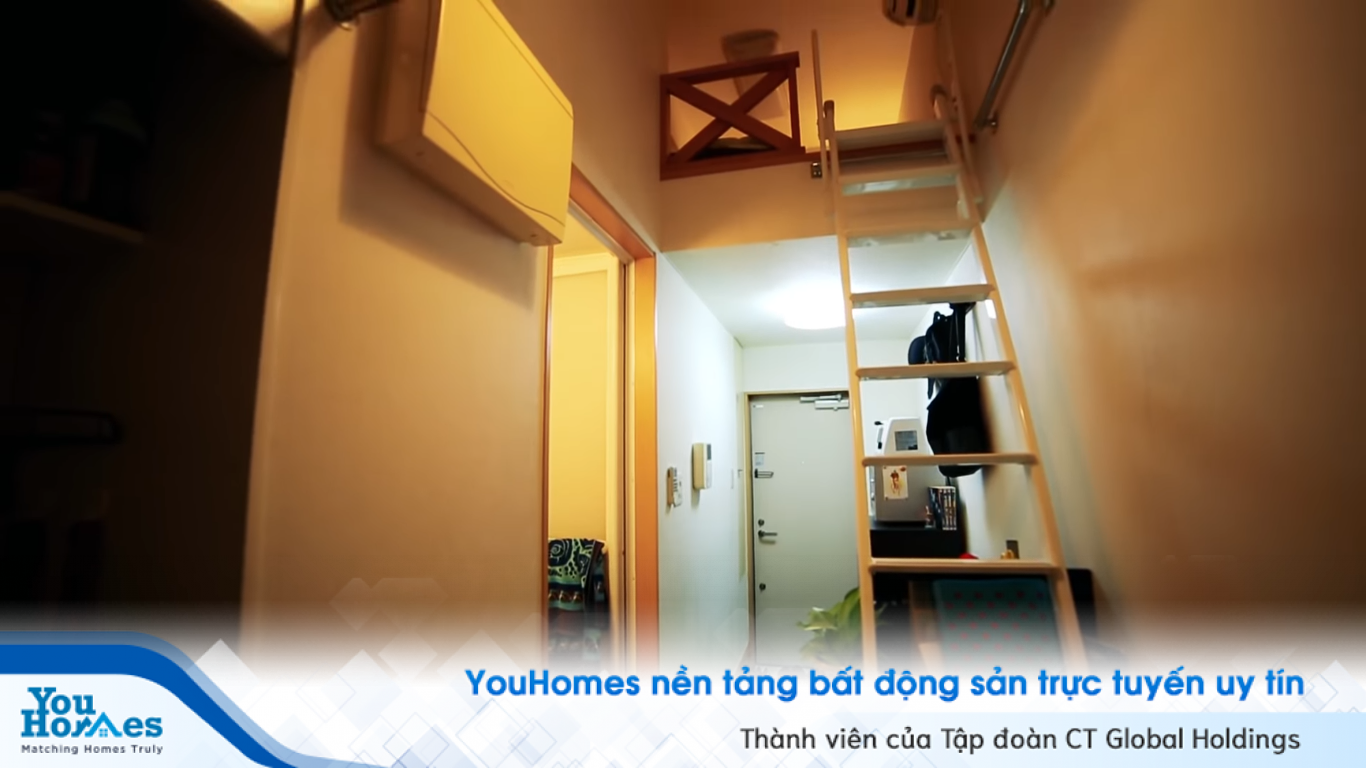 Toàn cảnh căn hộ với các không gian được tận dụng triệt để. Không gian để tủ giày, tủ đựng đồ và bàn làm việc được đặt san sát nhau. Để lên được tầng lửng có thể sử dụng một chiếc thang nhỏ do diện tích hạn chế không thể có vị trí để làm cầu thang. Phần tầng lửng được sử dụng làm phòng ngủ để đảm bảo sự riêng tư và kín đáo.