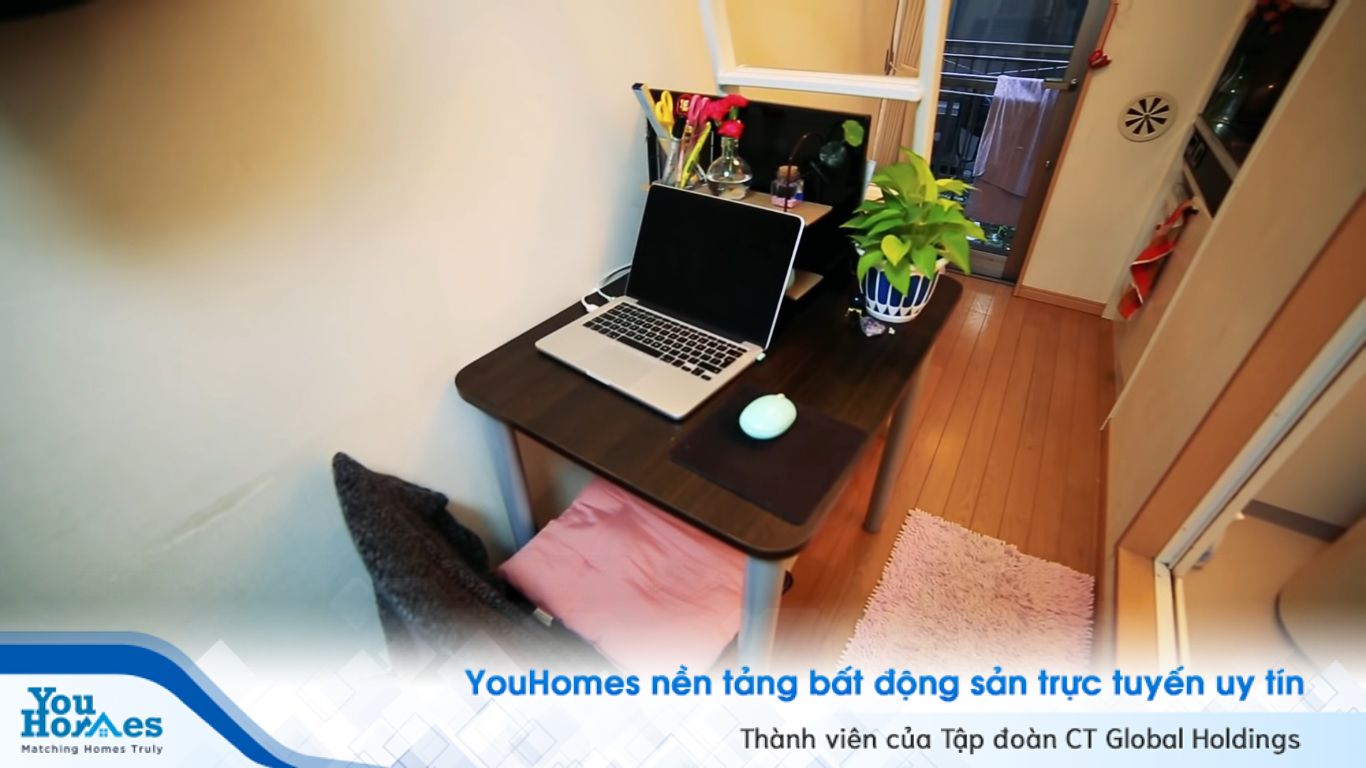 Khu vực bàn làm việc nhỏ nhắn ở góc phòng. Bên cạnh là phòng vệ sinh và trước mặt là không gian bếp. Phần ban công được tận dụng sử dụng làm nơi phơi quần áo và bày các cây cảnh nhỏ.
