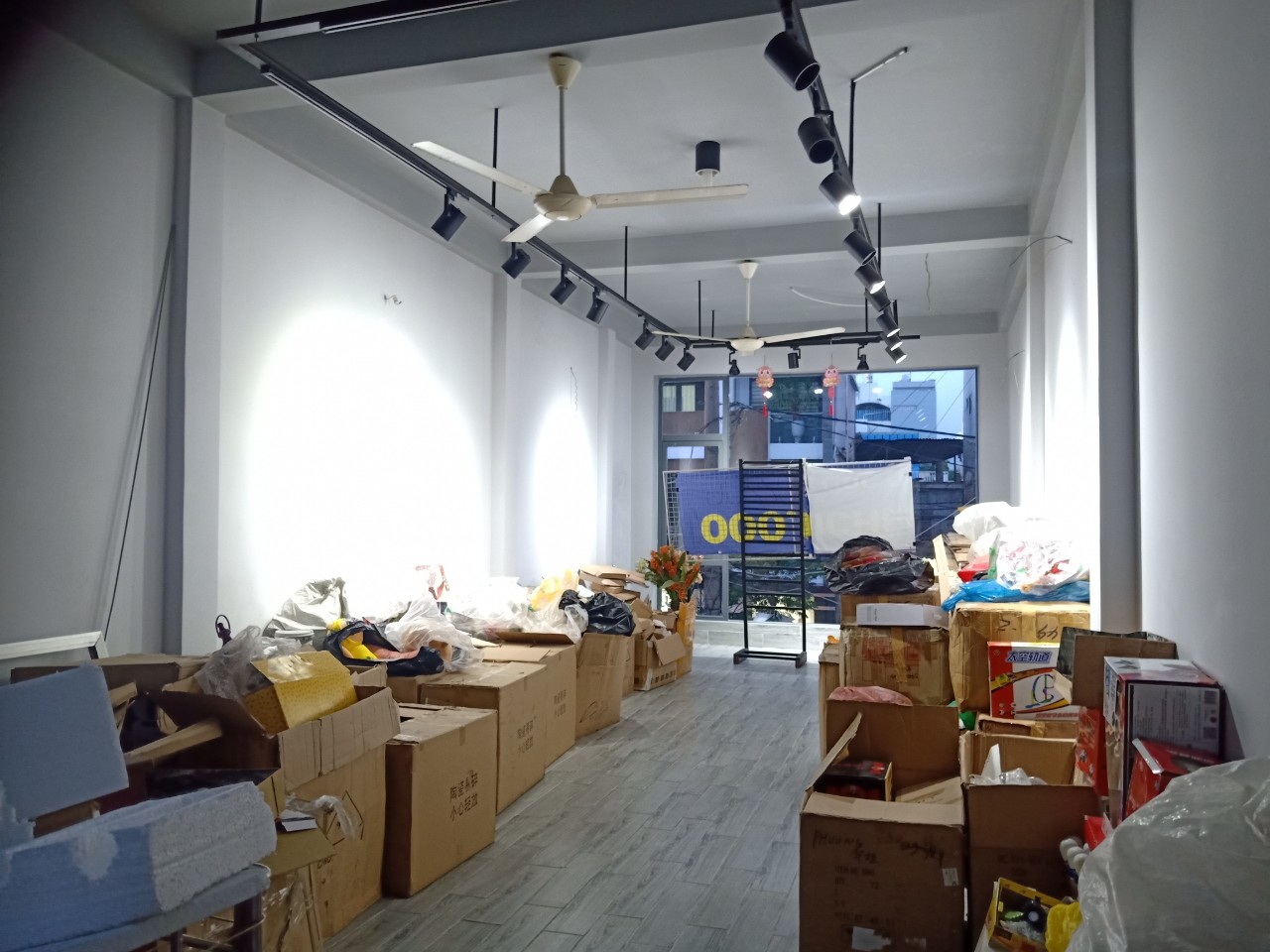 Nhà kết cấu 2 tầng, thông từ đầu đến cuối. Sàn gỗ, sẵn hệ thống đèn điện, cửa cuốn, cửa kính.