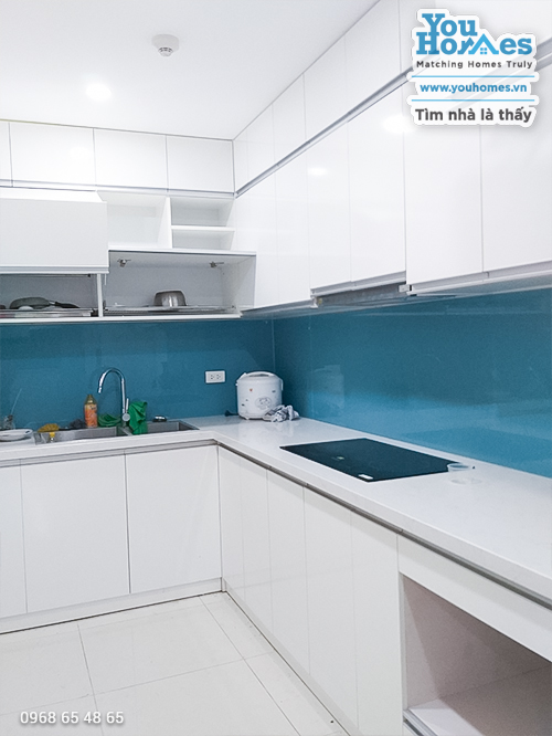 - Khu vực bếp: Tủ bếp, bếp từ, hút mùi