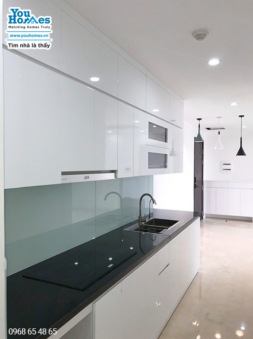 + Phòng bếp trang bị đồng bộ tủ bếp, bếp từ, máy lọc nước uống ngay, bình nóng lanh, vòi chậu rửa bát, máy hút mùi và có cửa thống với logia phụ thông thoáng, có thiết bị báo cháy tự động.