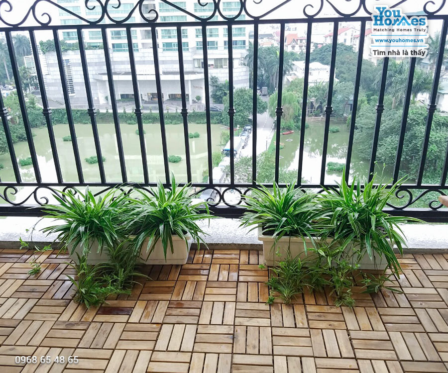 - Ban công chính hướng Đông Nam mát mẻ, view hướng ra đường đường Đặng Thai Mai và khách sạn Fraiser Suite, bên dưới là Ao Giặt Lụa trên đường vào Phủ Tây Hồ.