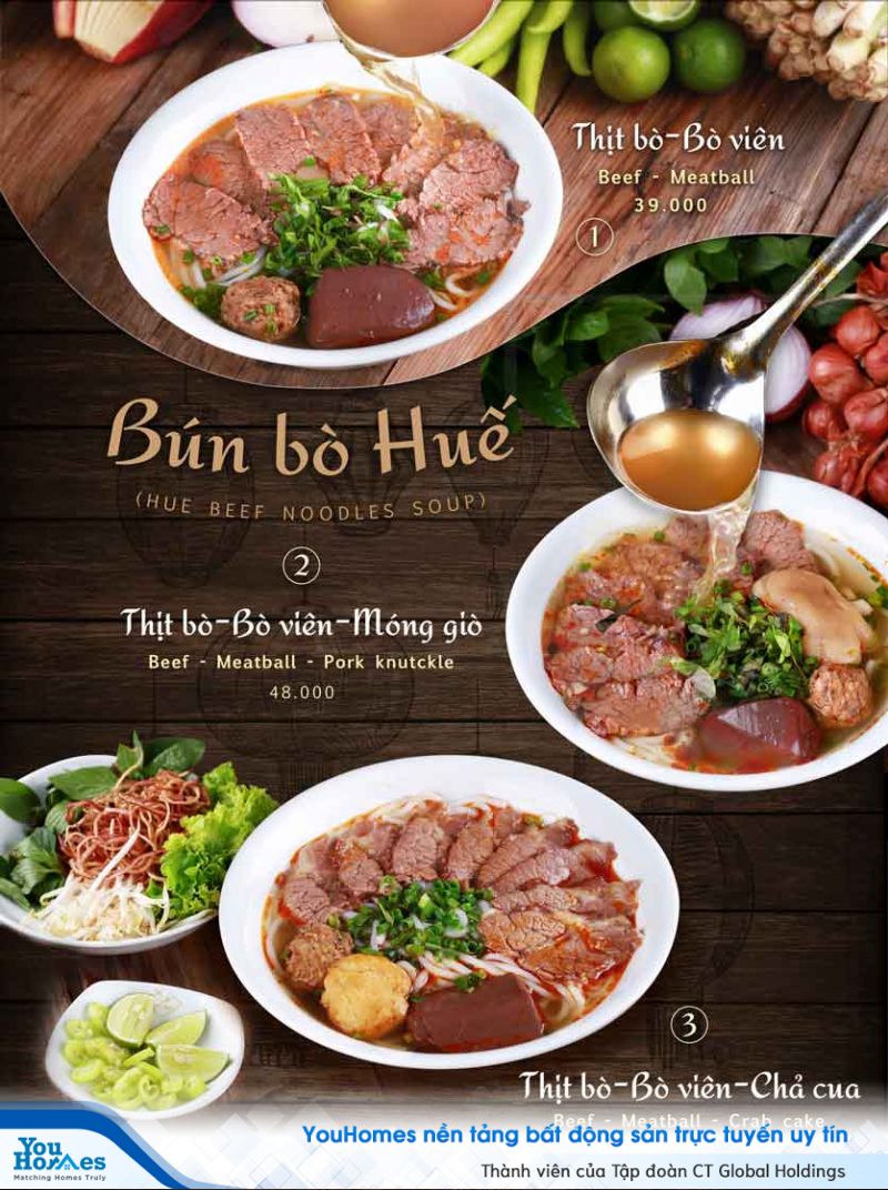 Nhà hàng Nét Huế xây dựng một thực đơn rất phong phú với những món ăn đặc trưng của Huế, đậm chất Huế giữa lòng Hà Nội: Bún bò Huế, nem lụi, bánh lọc, hến xúc bánh tráng, sườn cốt lết nướng mắm ruốc, lẩu bò nhúng dấm, cơm cá bông lau kho tộ, chè sen Huế,... món nào ăn vào cũng nhớ ngay đến hương vị của Huế và nhớ nhất vẫn là hương vị của tô bún bò Huế đậm vị, ngọt nước và thịt bò tái nhẹ ngồi húp xì xụp vừa thổi vừa ăn.